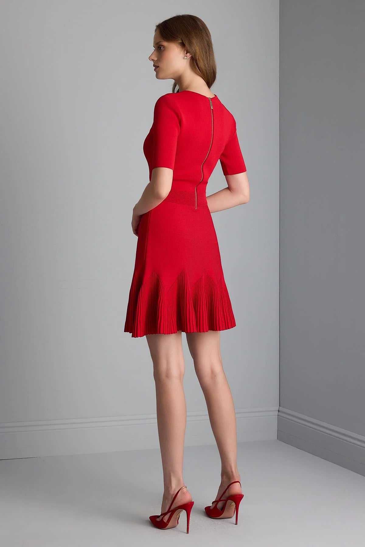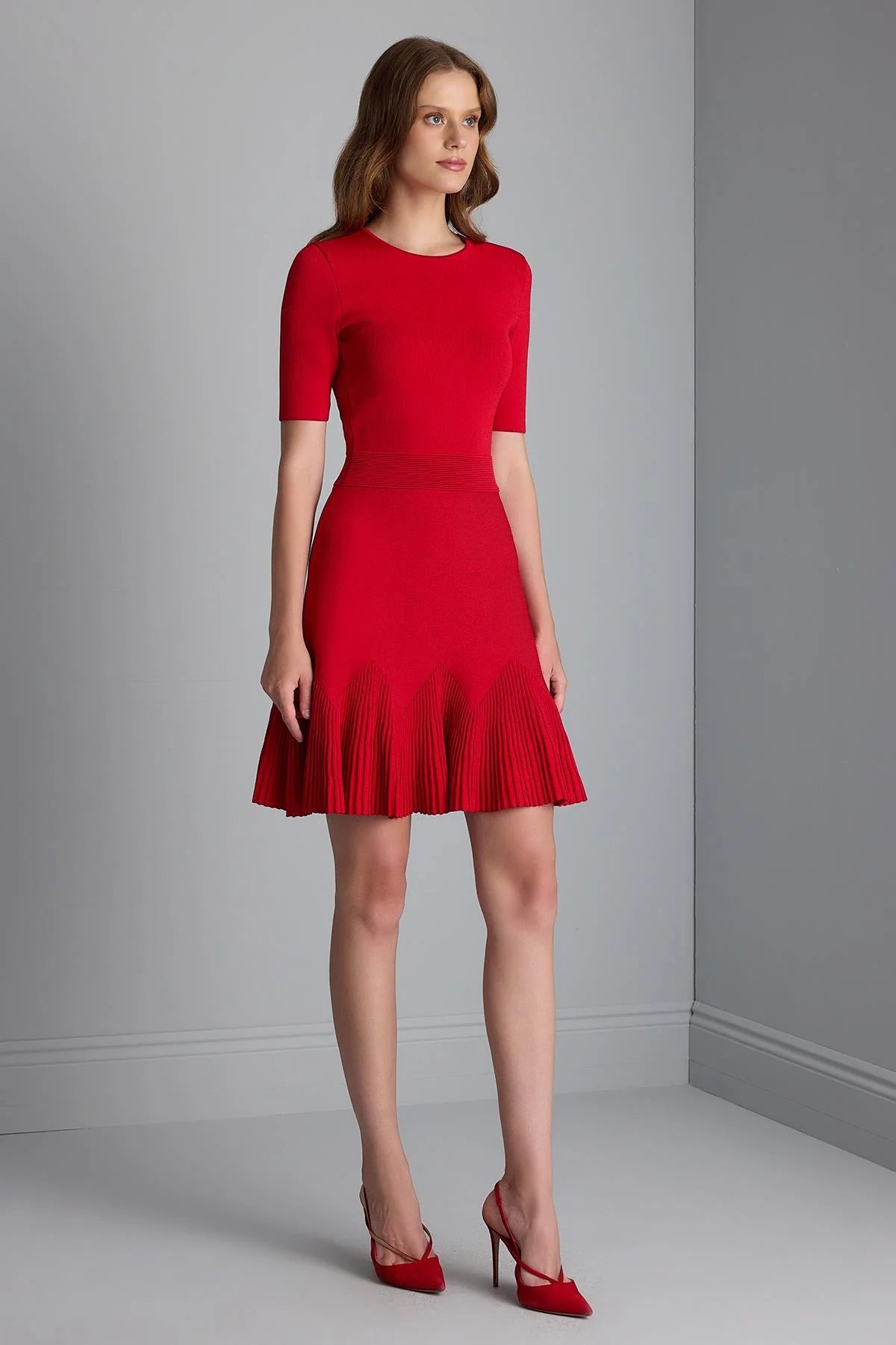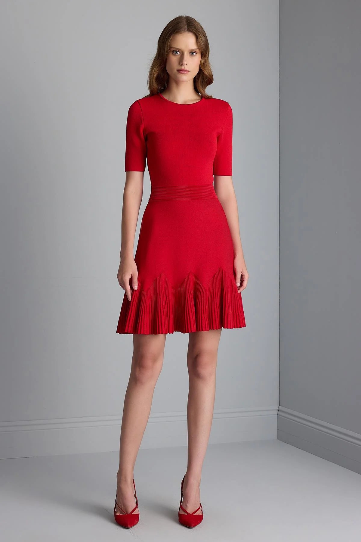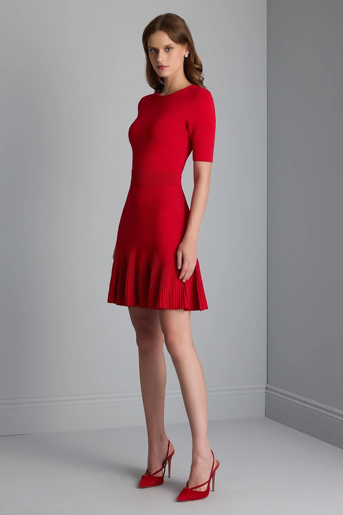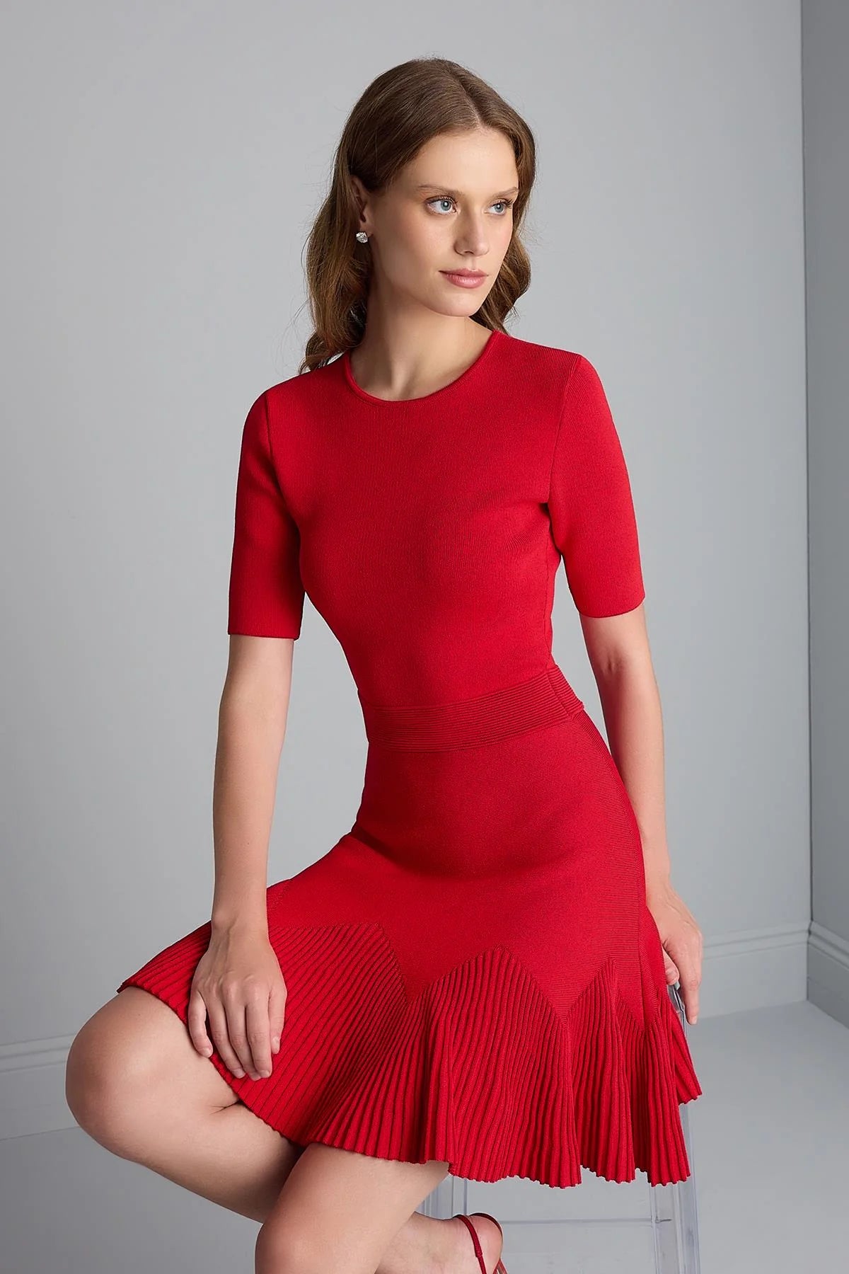 Beli Kemer Detaylı Kloş Mini Triko Elbise