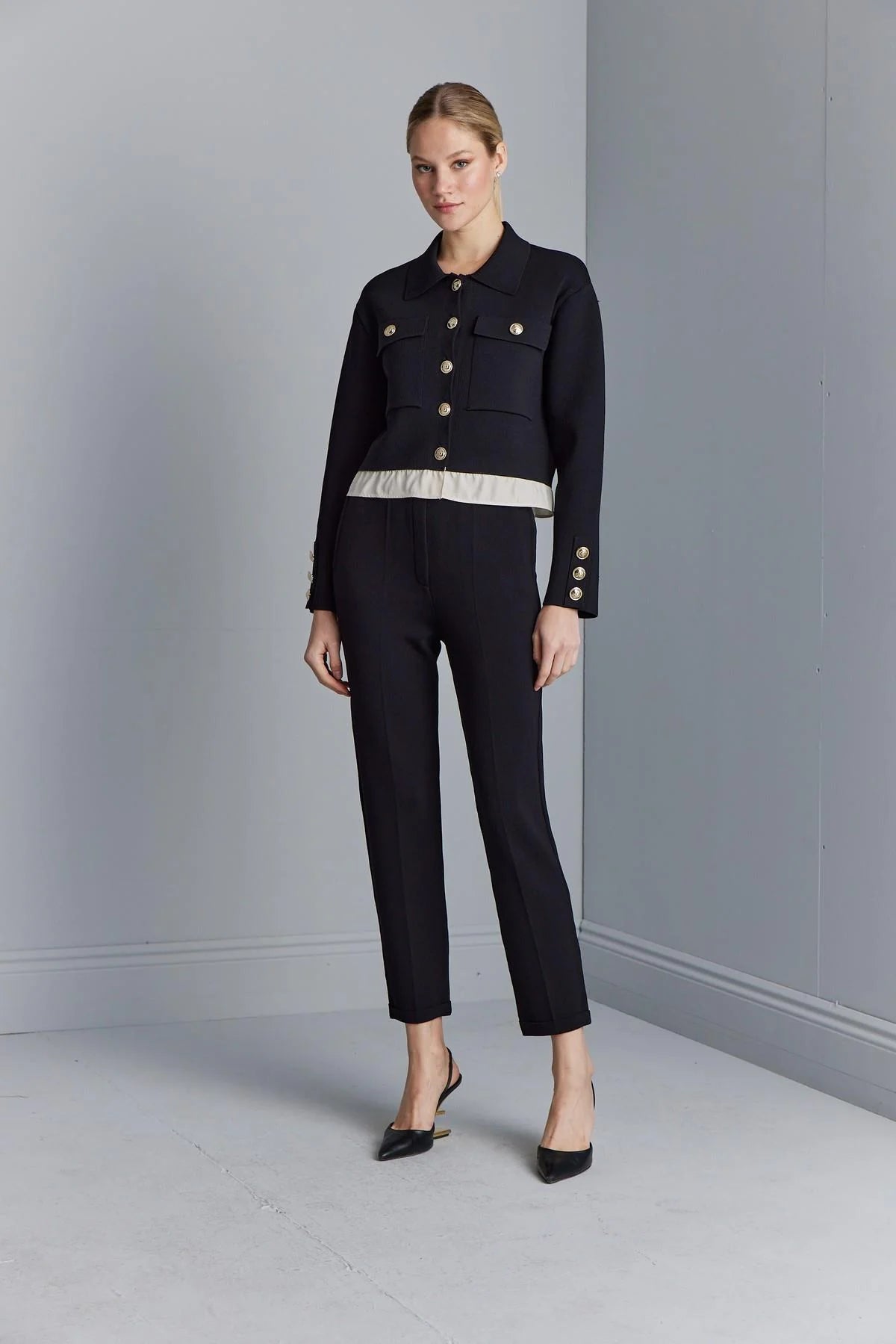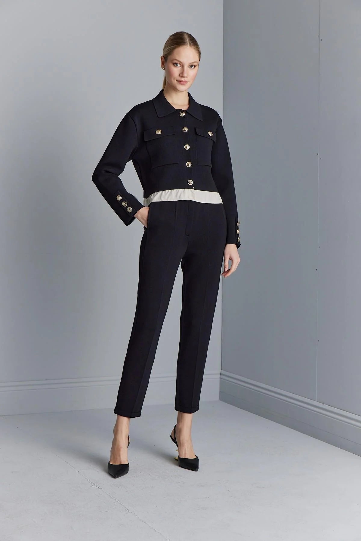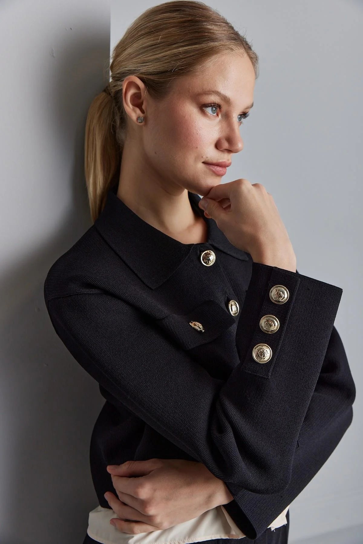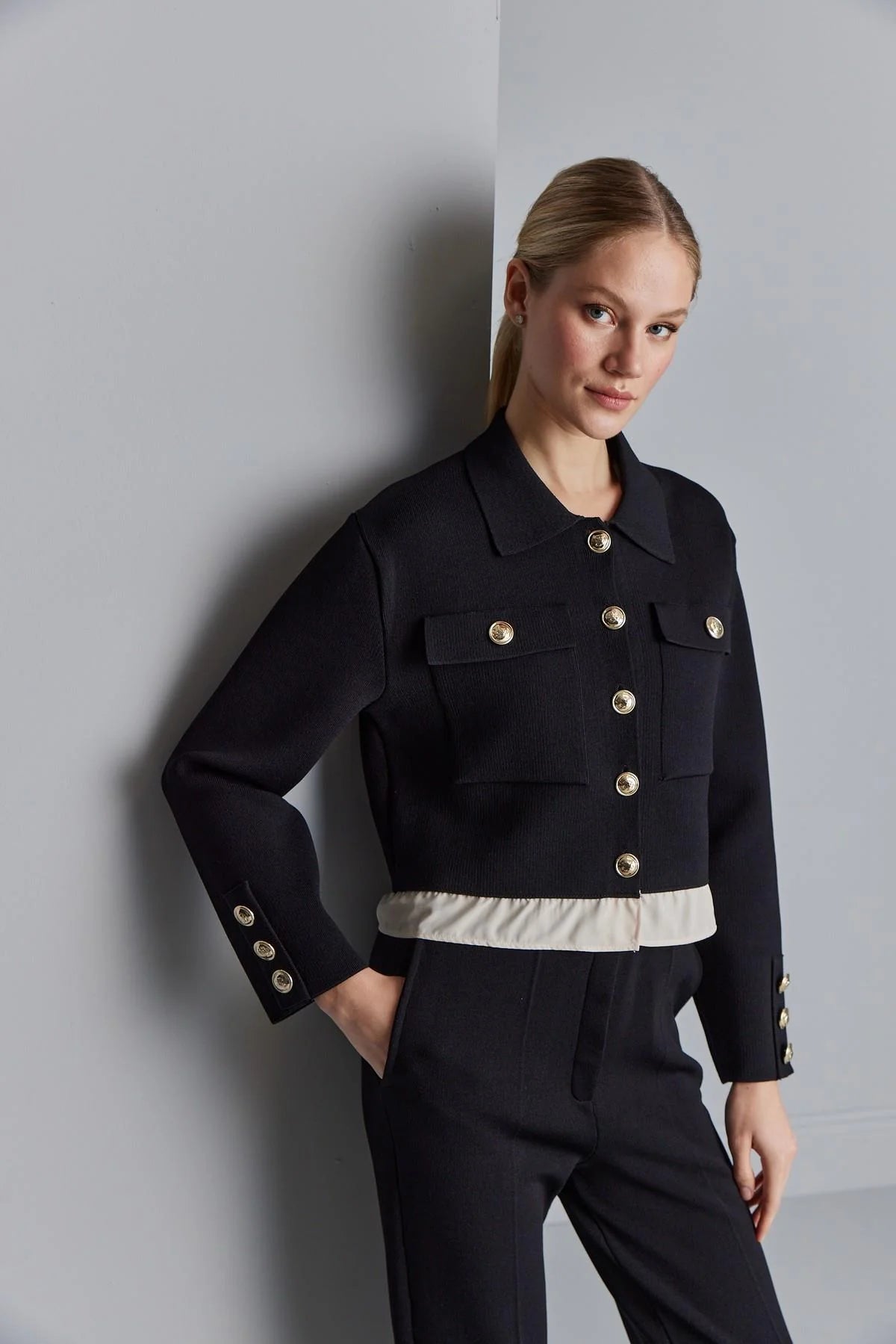 Gold Düğme Detaylı Cepli Triko Ceket