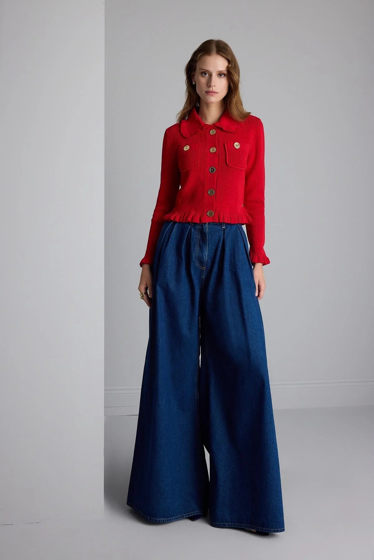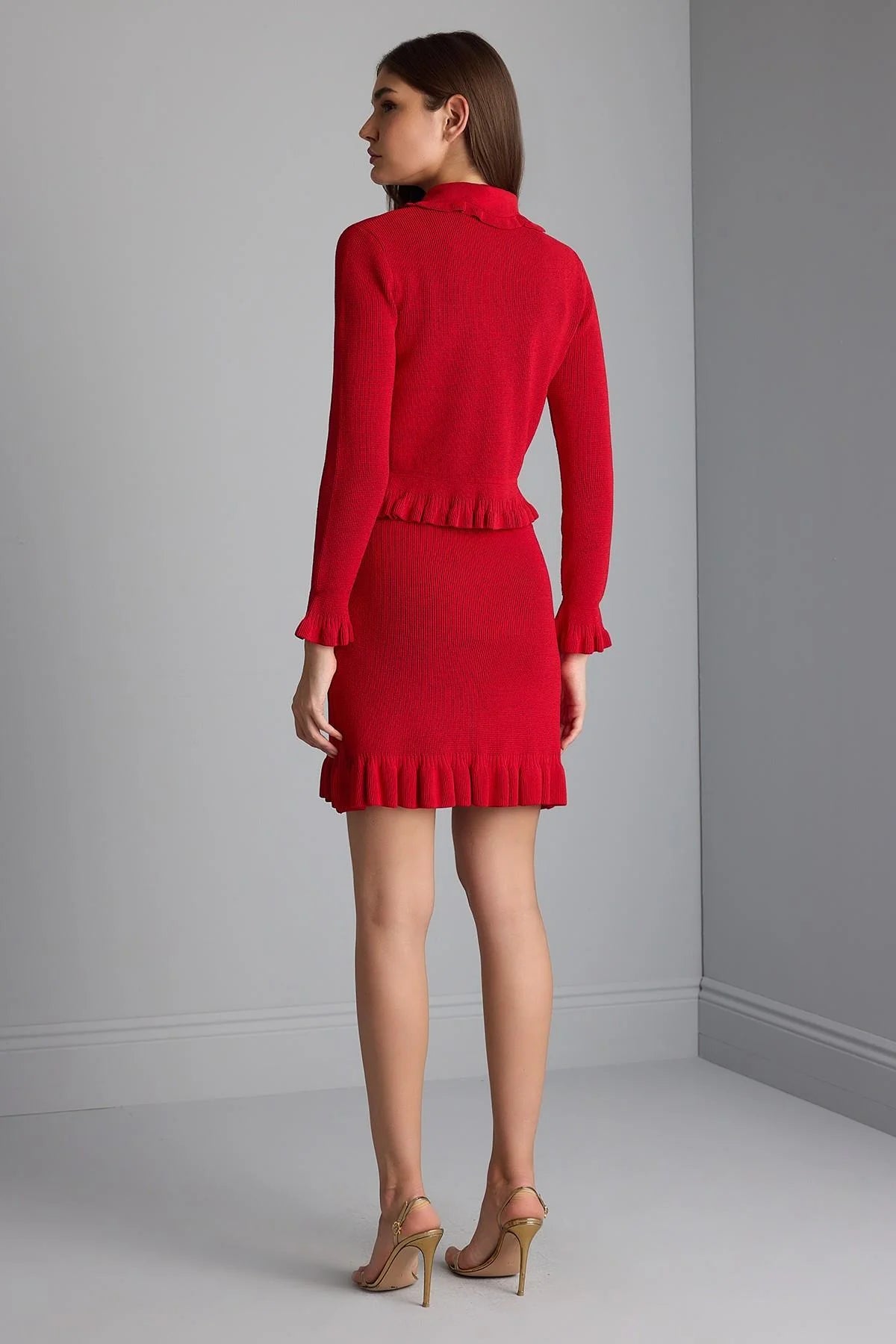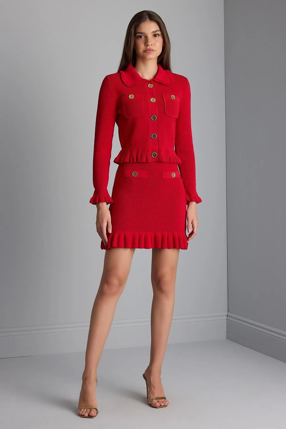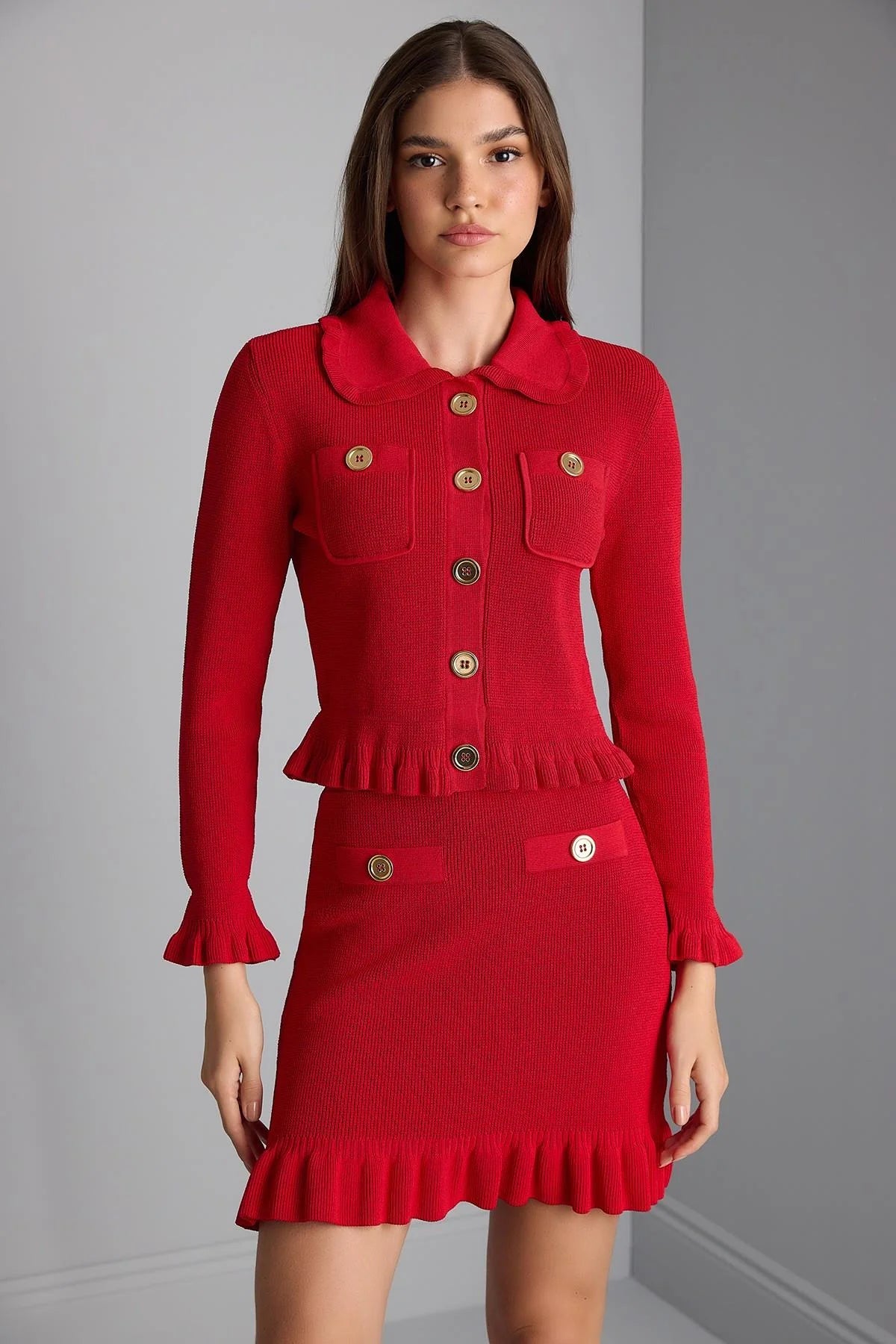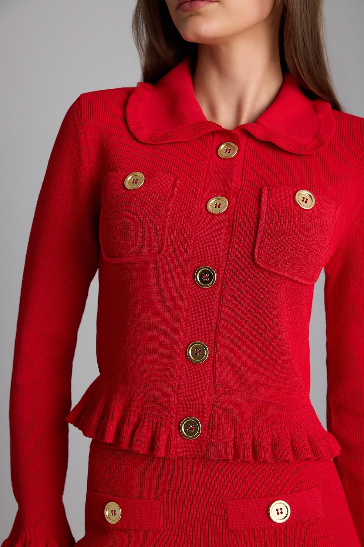 Gold Düğmeli Dokulu Kırmızı Triko Ceket