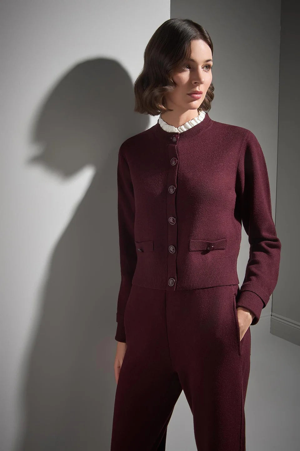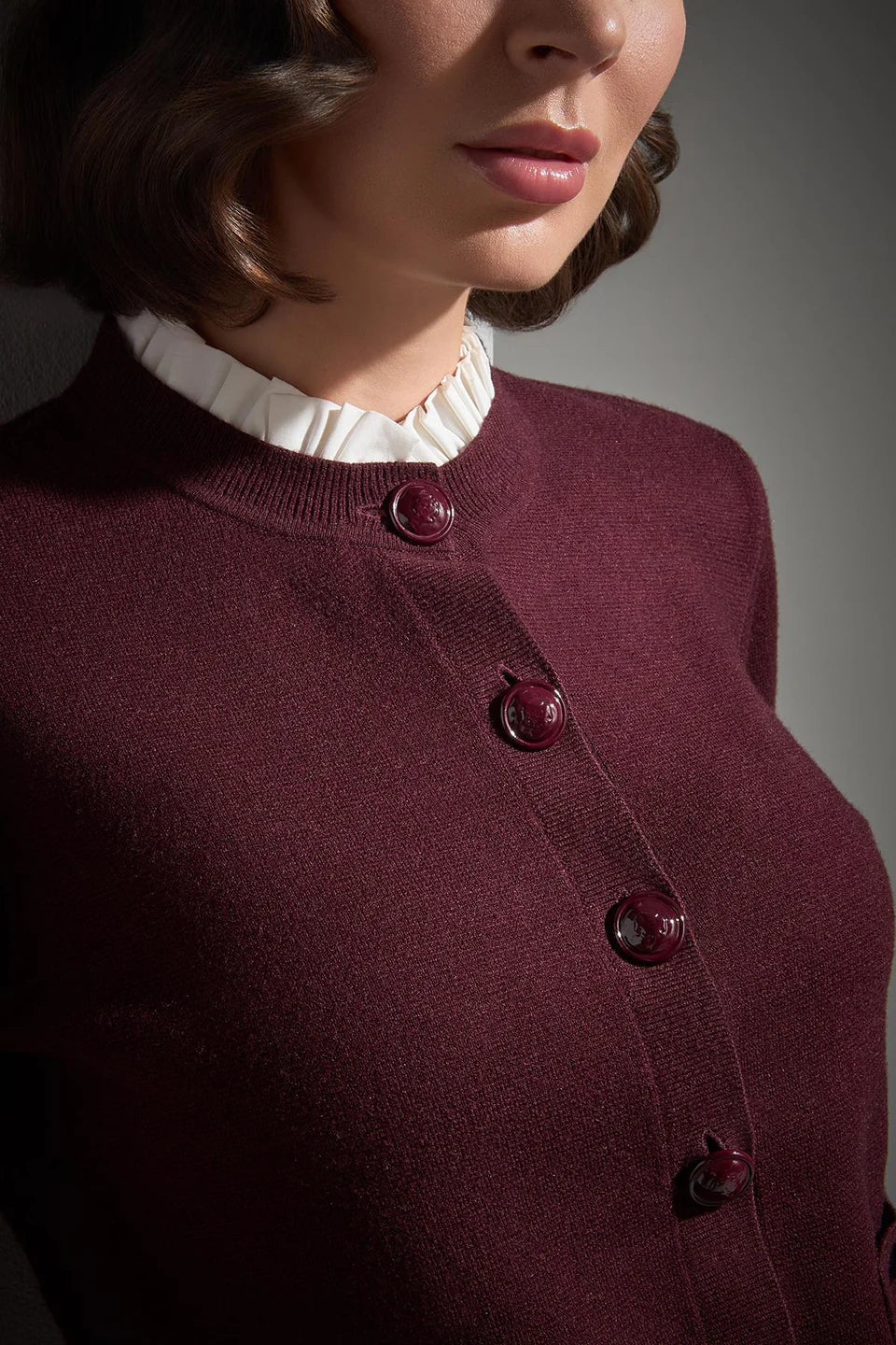 Kumaş Detaylı Düğmeli Bordo Triko Hırka