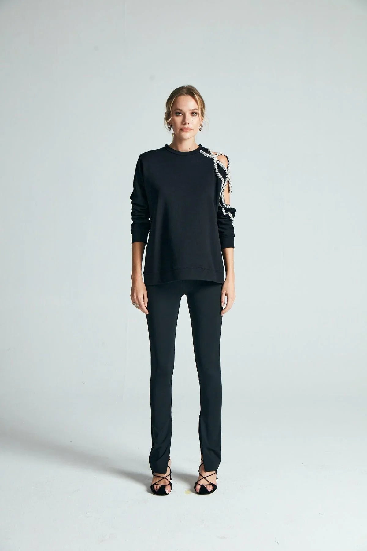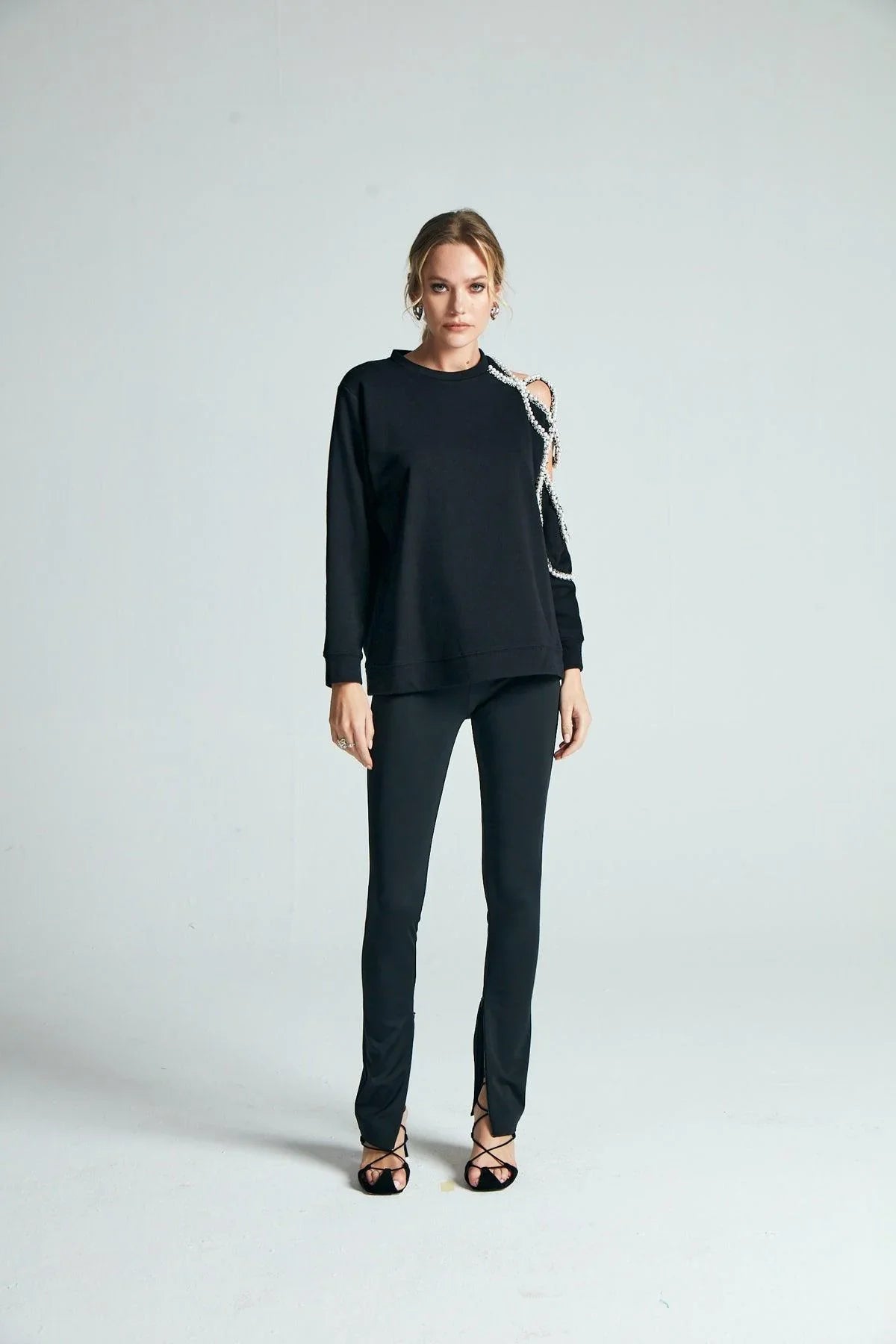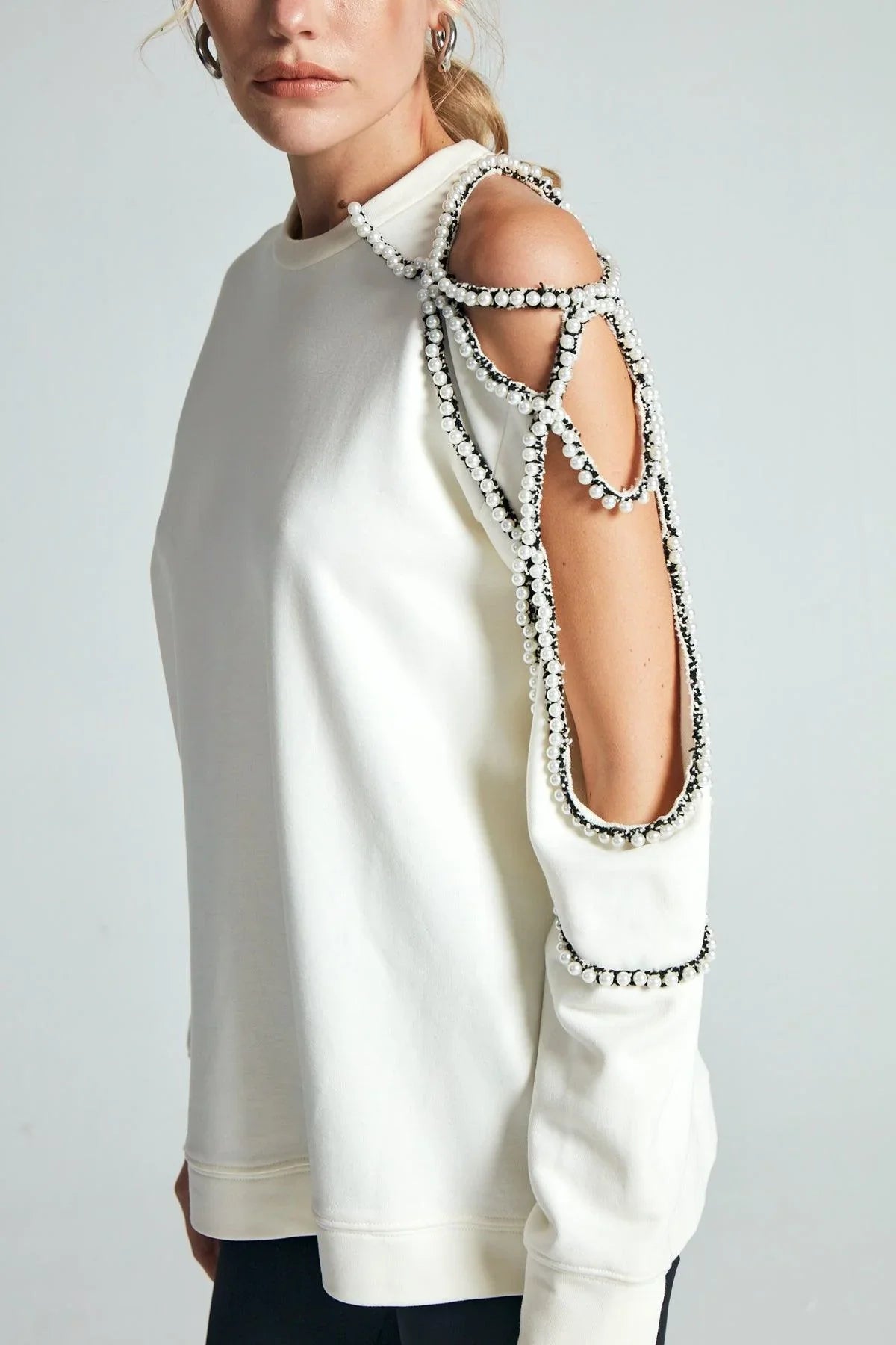 Ürün Açıklaması:Tek omuzu incili aksesuar işlemeli ve dekolteli, bisiklet yaka sweatshirt Kumaş Bilgisi: %100 Cotton Bakım Önerileri: 30º Max Yıkama Tersten yıkayın Ağartıcı kullanmayın Tamburlu kurutma yapmayın Orta ısıda ütüleme yapın Kuru temizleme yapılabilir.