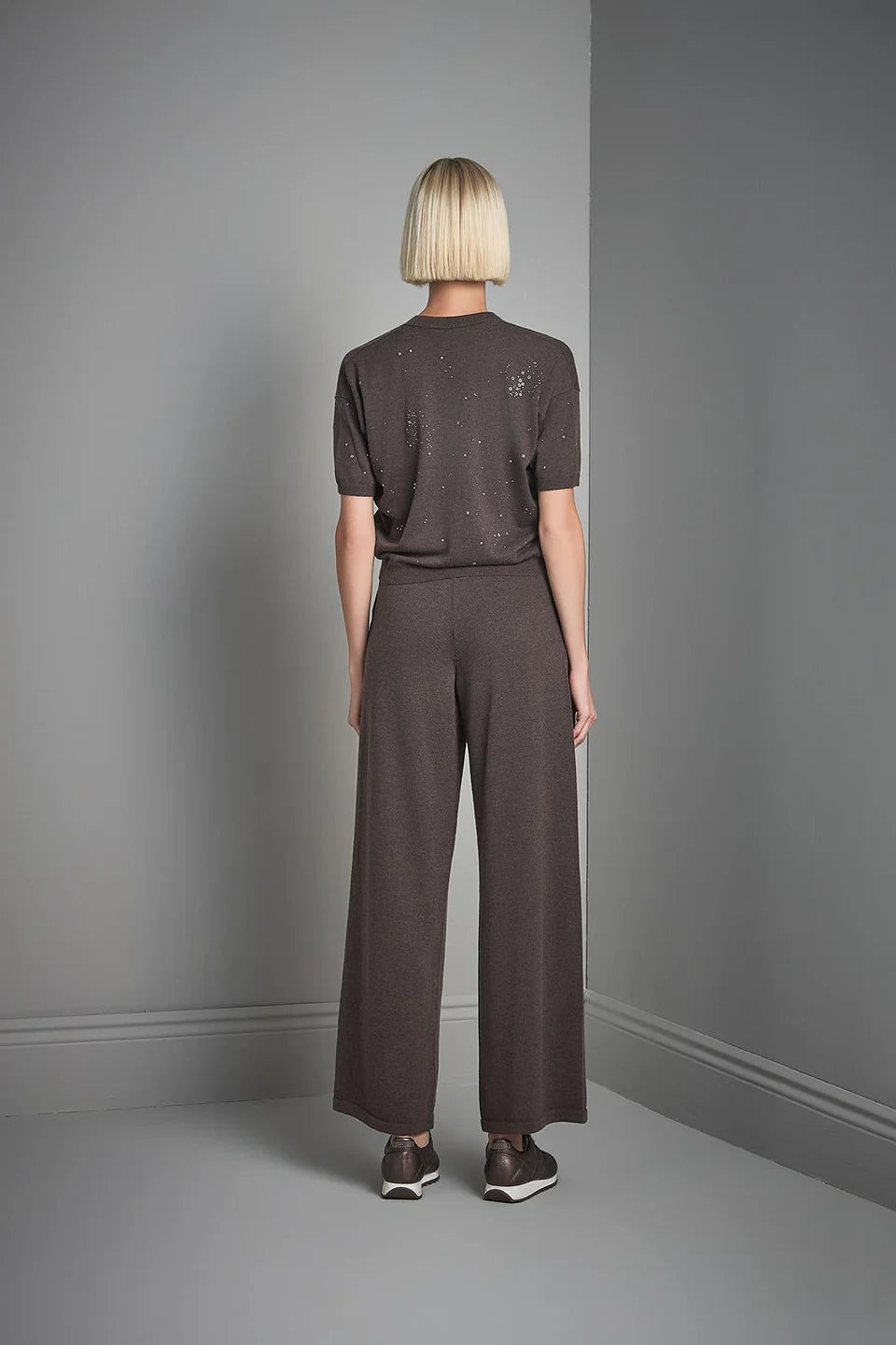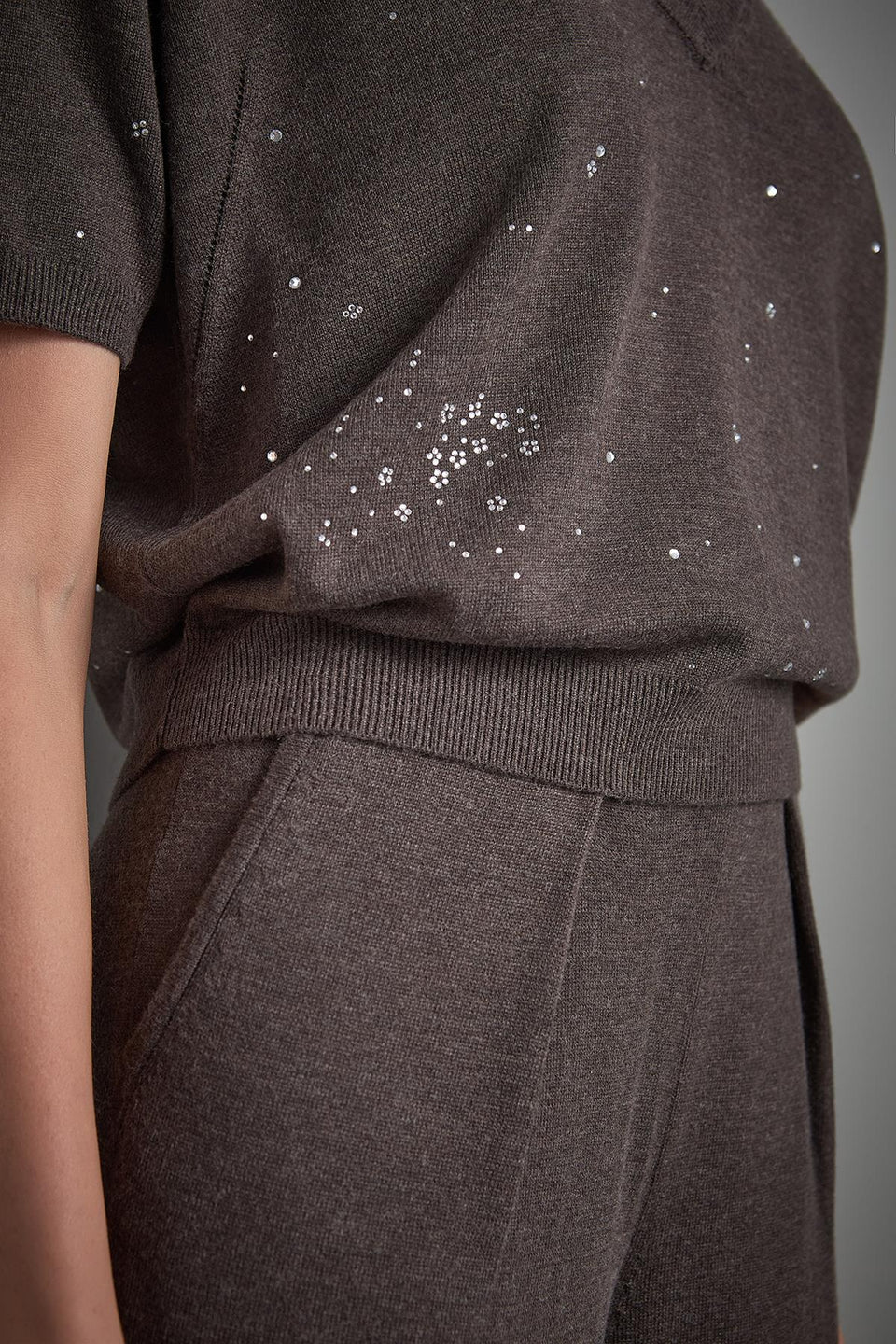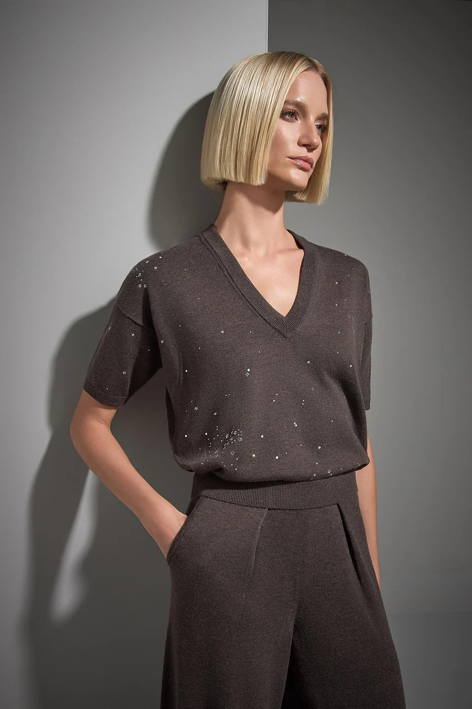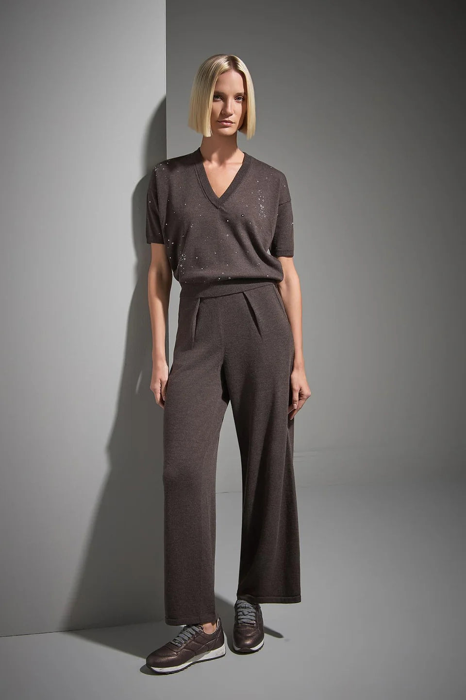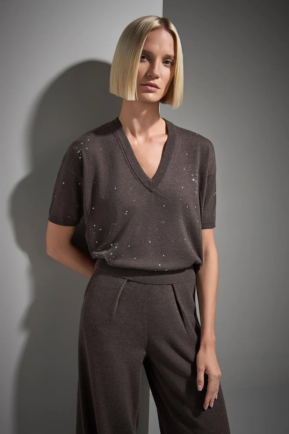 V Yaka Taş baskılı Kahverengi Triko Kazak